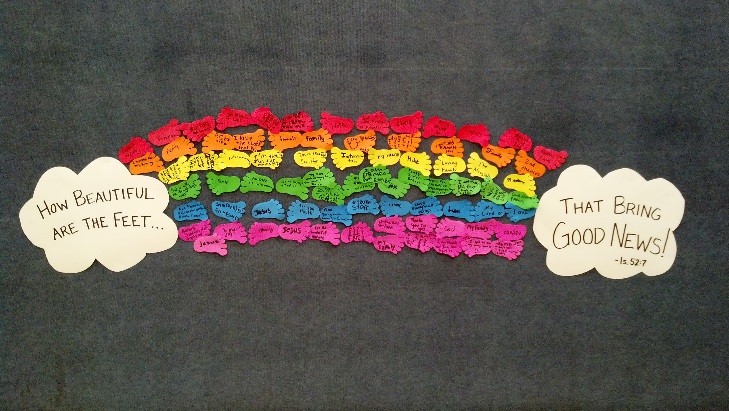 Recently, our children had the opportunity to share the reasons they were thankful in the midst of their storms. They wrote their prayers of thanksgiving on multi-colored foam feet that were displayed as a rainbow on the wall of our multi-purpose room where we meet for chapel services. They thanked God for Jesus, for family, for friends, for staff, for teachers, for love, and for hope. Their words inspired all of us that walked by the rainbow this Spring to think of reasons we have to be thankful. I was challenged to consider the good news that the rainbow does bring—behind the clouds of our despair, the sun still shines, and someday soon it will break through and once again give us its light.